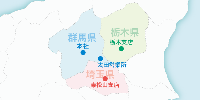 当社は群馬県高崎市に本社を構え、平成23年6月より栃木県栃木市、平成27年11月より埼玉県東松山市に支店を開設いたしました。
