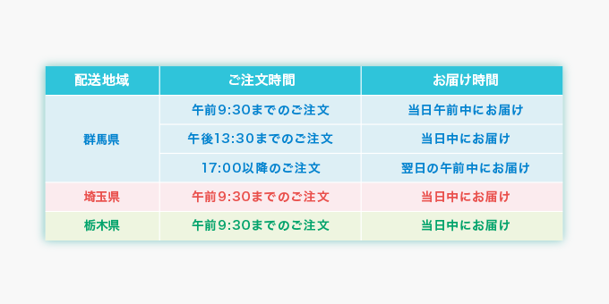 ※ 群馬県の一部地域に関しては当日午前中にお届けできない場合がございます。